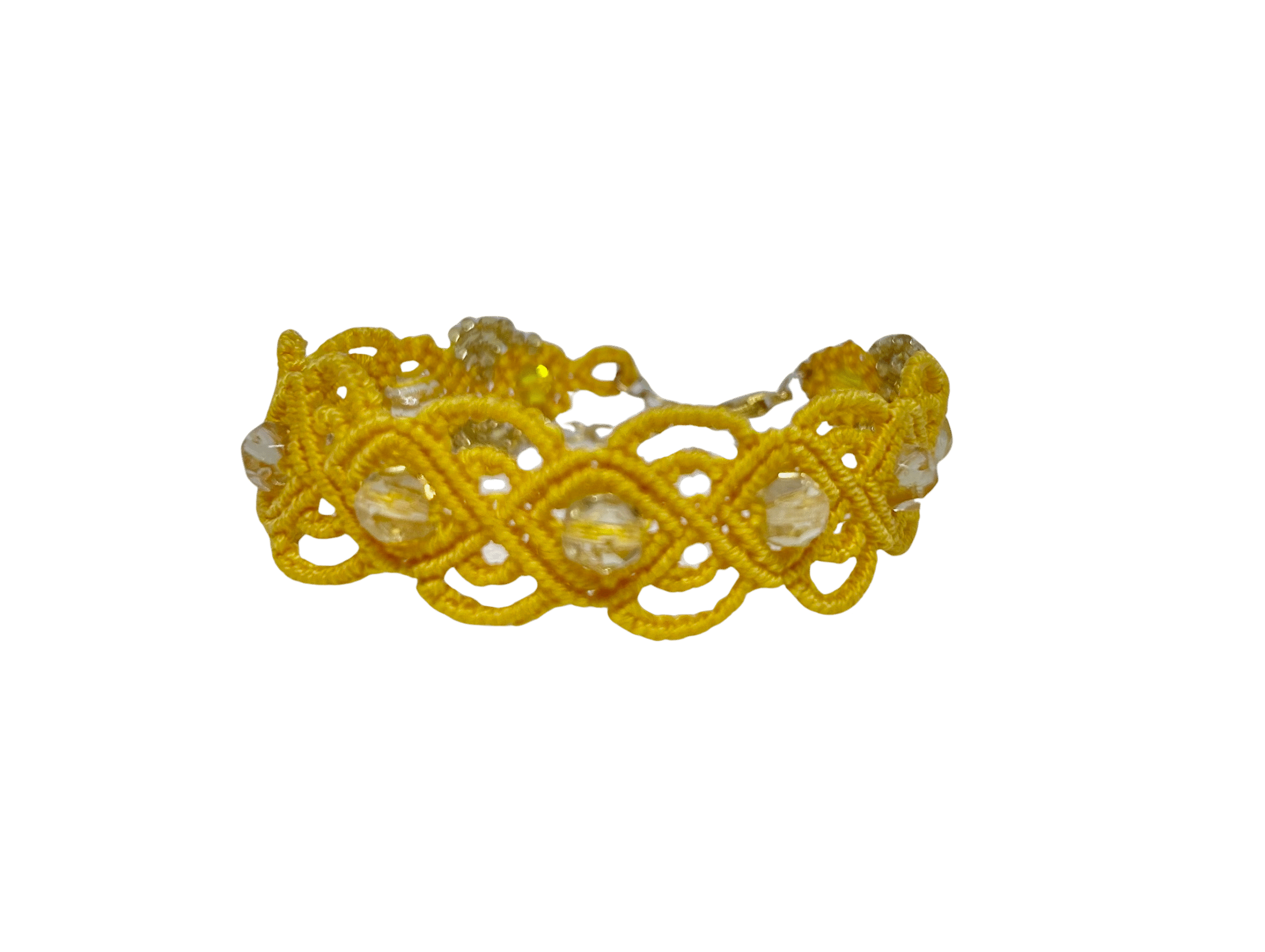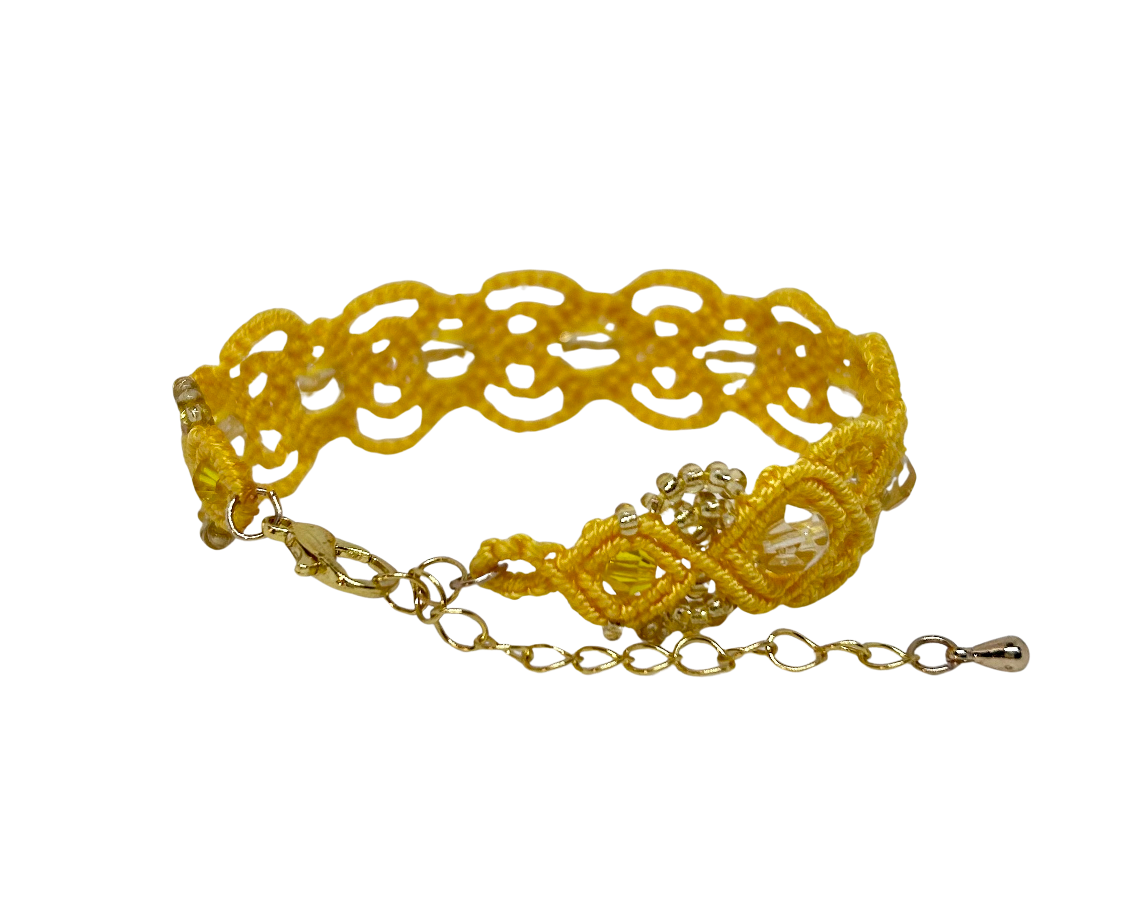 Valmistatud kvaliteetsest S-lon mikro-makramee käsitööniidist, lisatud on klaasist seemnehelmed.