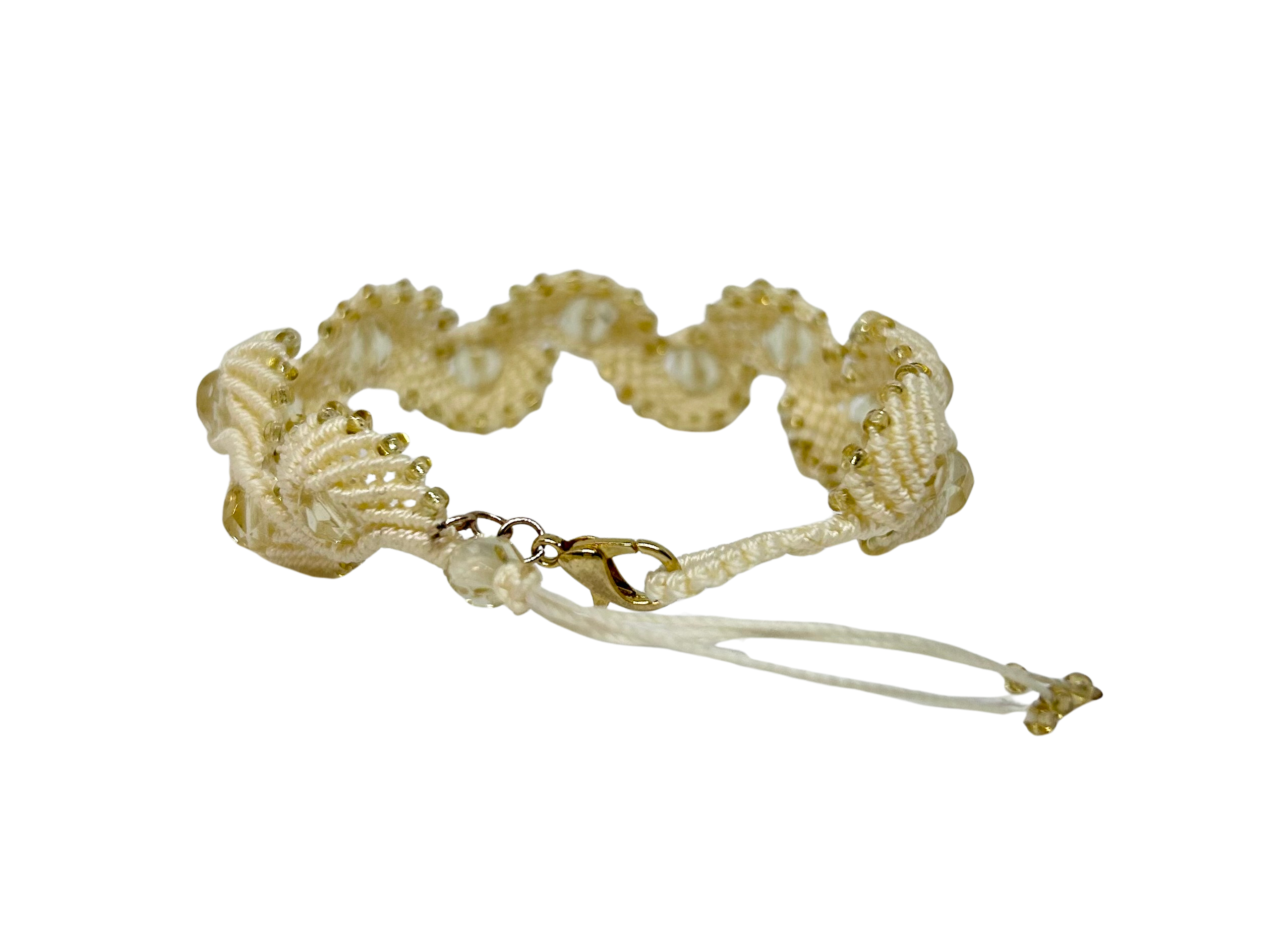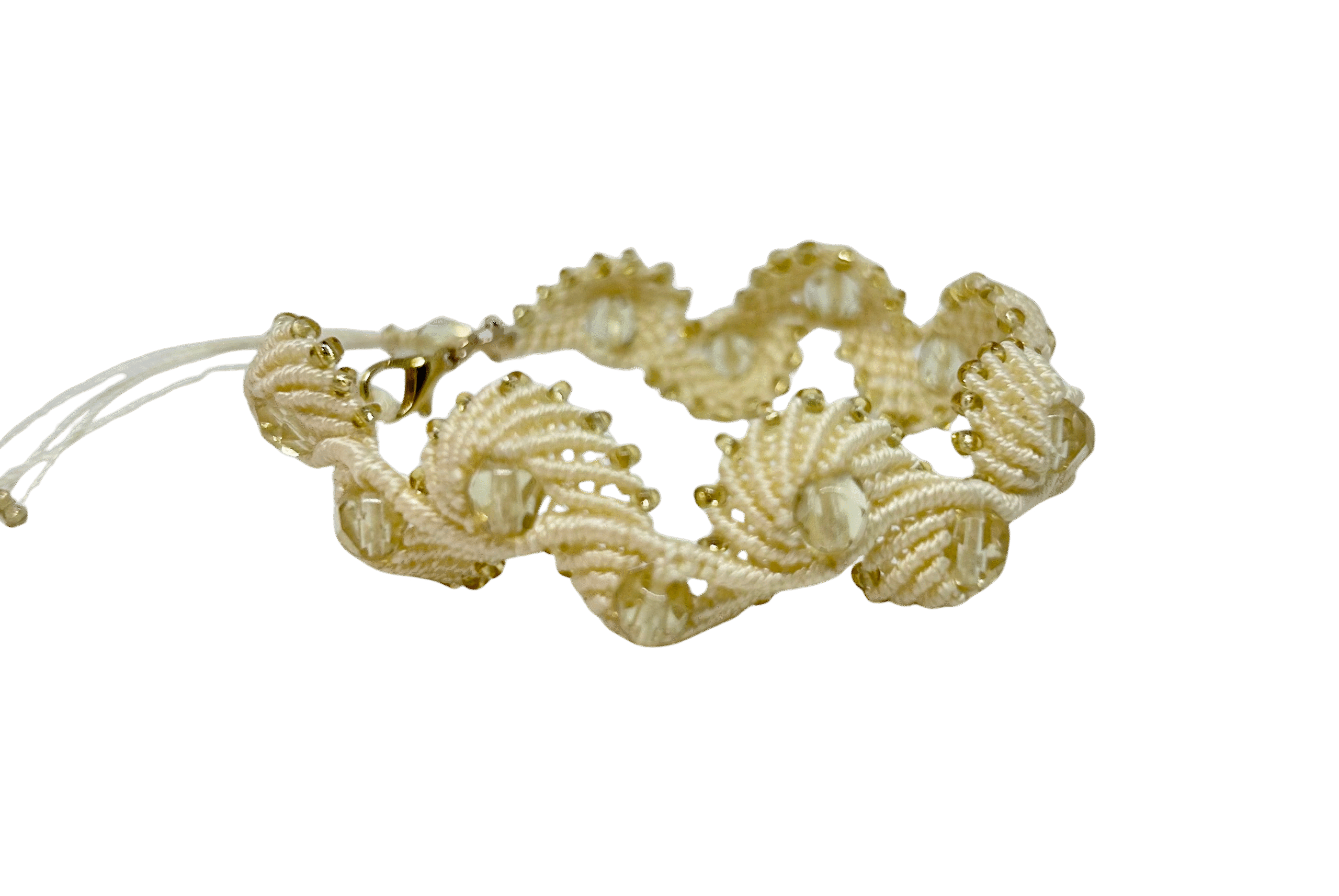 Valmistatud kvaliteetsest S-lon mikro-makramee käsitööniidist, lisatud on klaasist seemnehelmed.