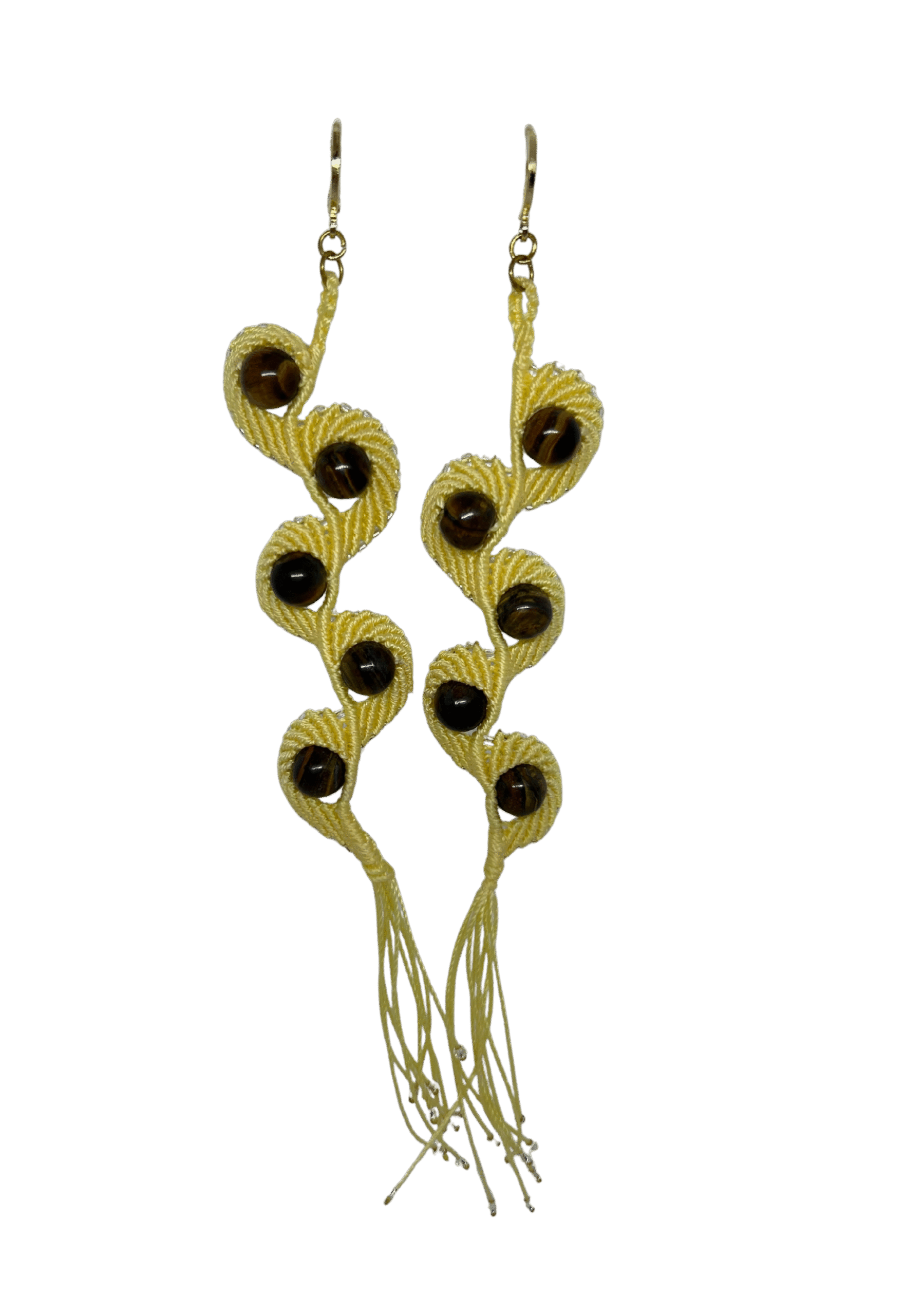 Kollased kõrvarõngad, poolvääriskivi tiigrisilm, mikromakramee käsitöö