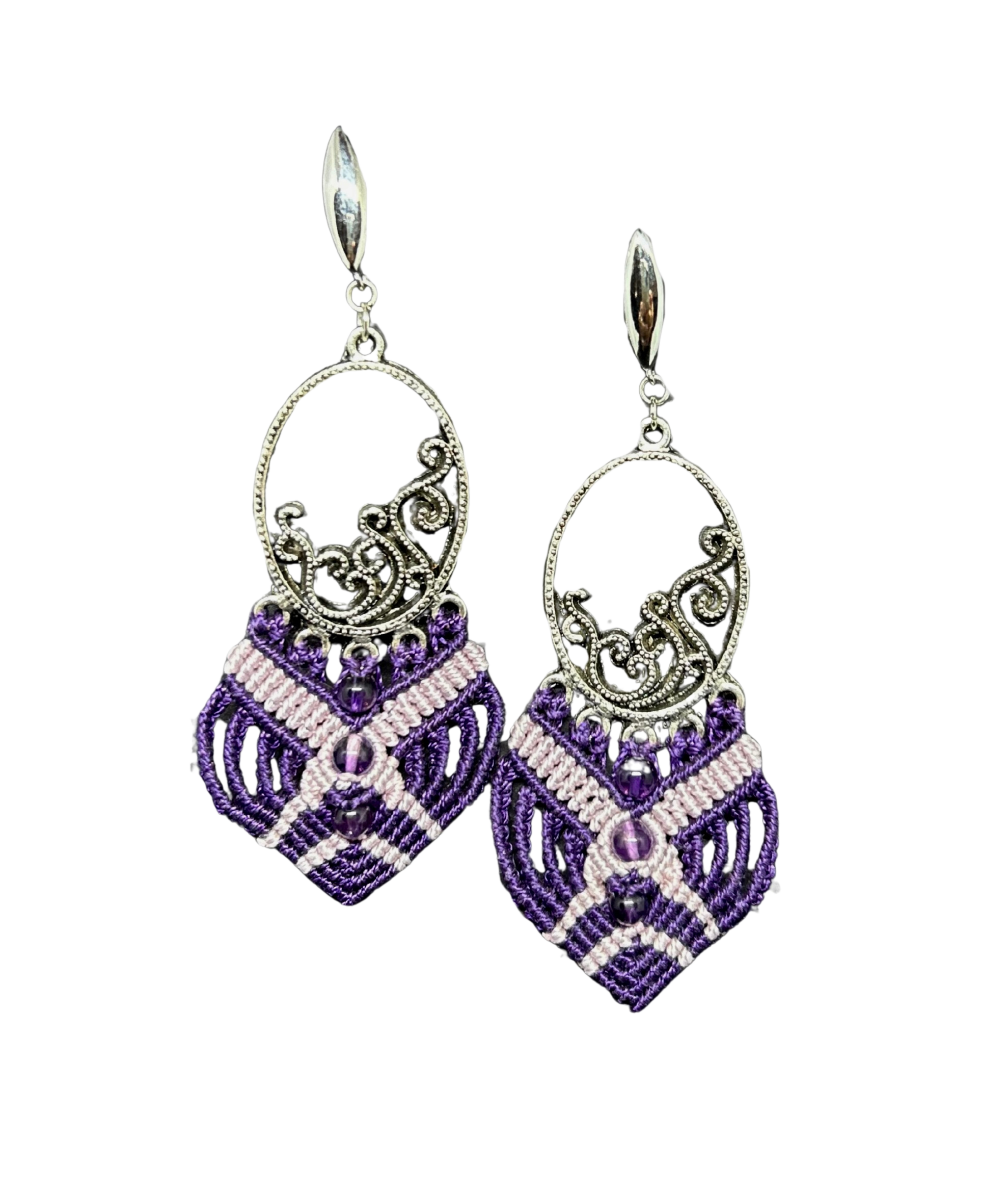 Kõrvarõngaste materjal on kvaliteetne S-lon mikro-makramee käsitööniit, lisatud on lillat tooni läbikumavad klaaspärlid.