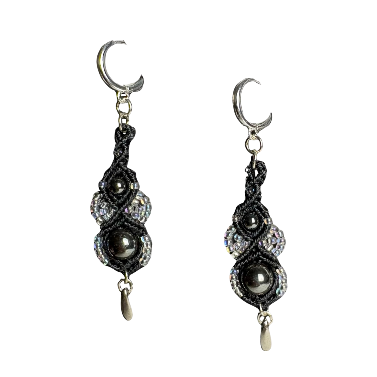Mustad, poolvääriskivi hematiit, hõbedast detailid, mikromakramee käsitöö kõrvarõngad