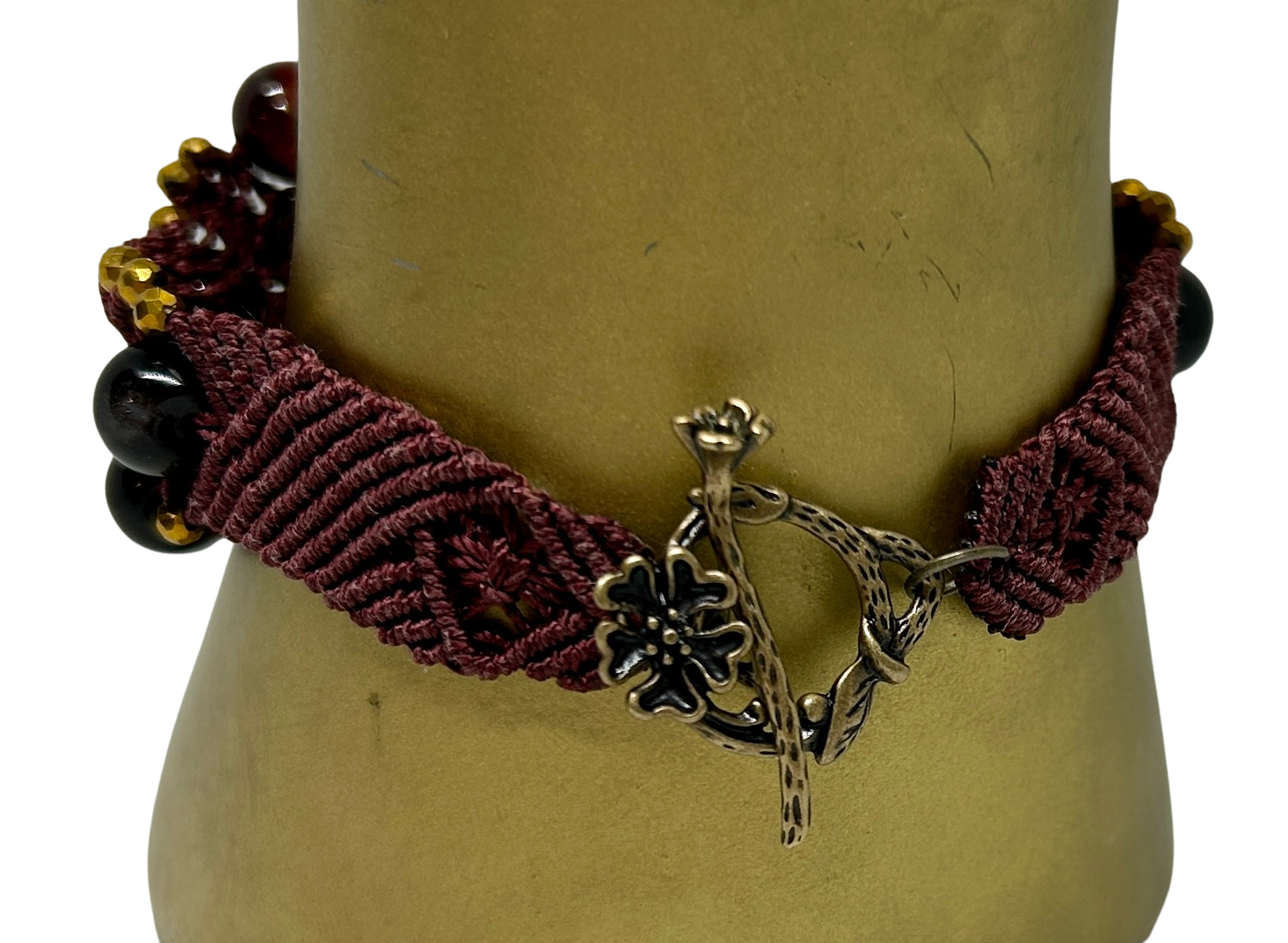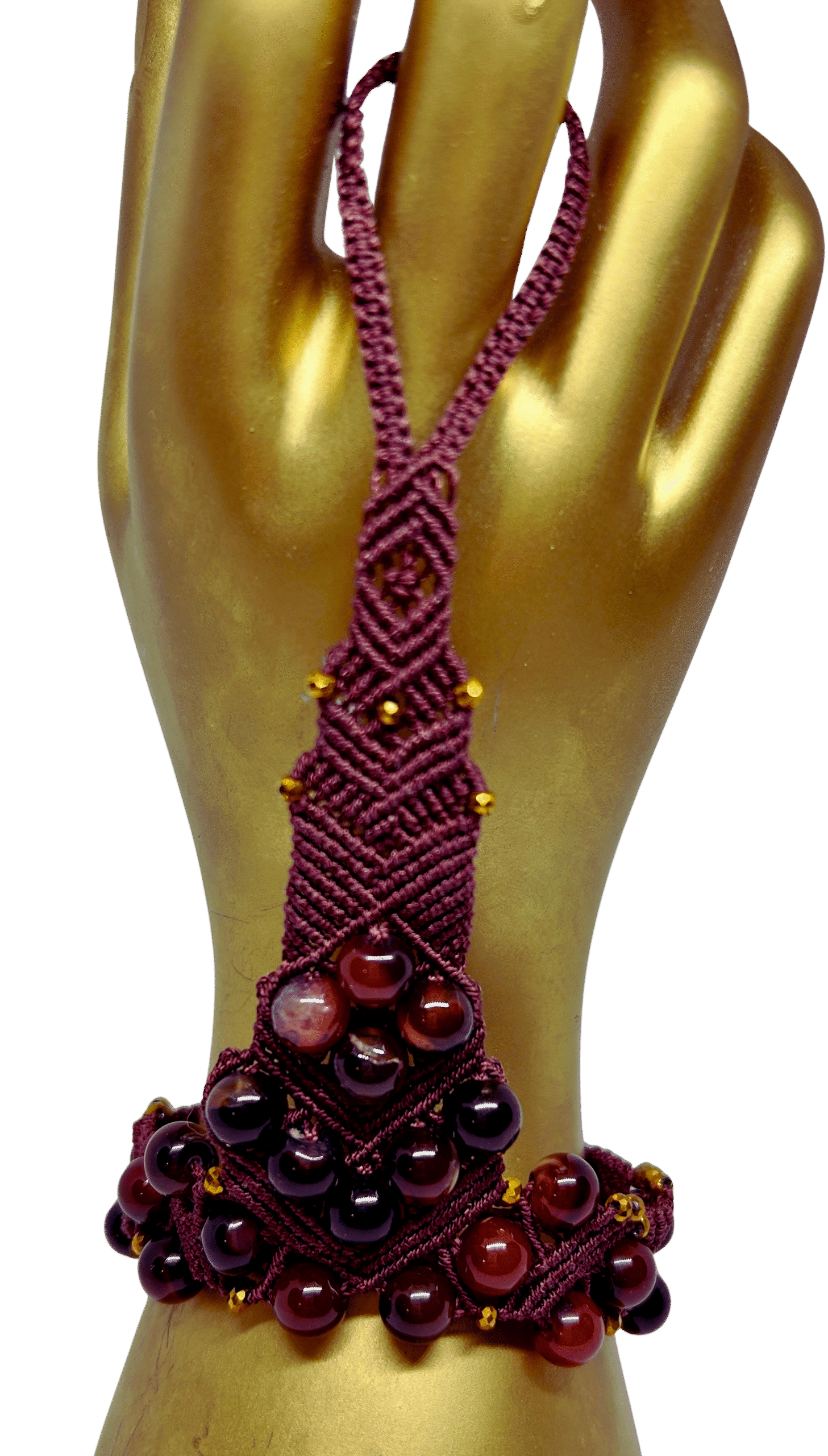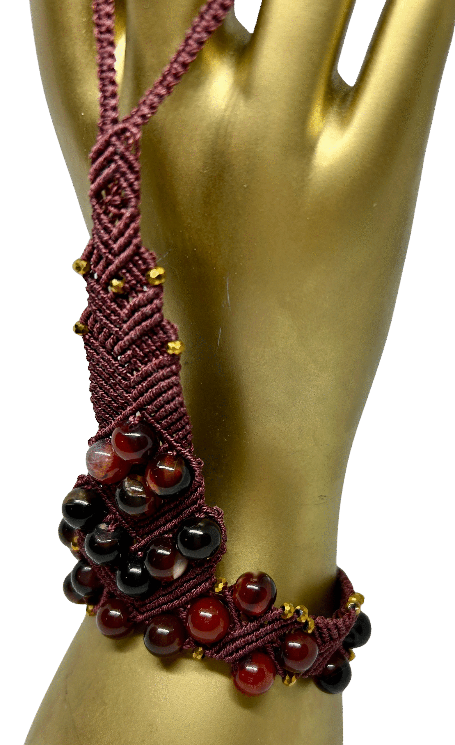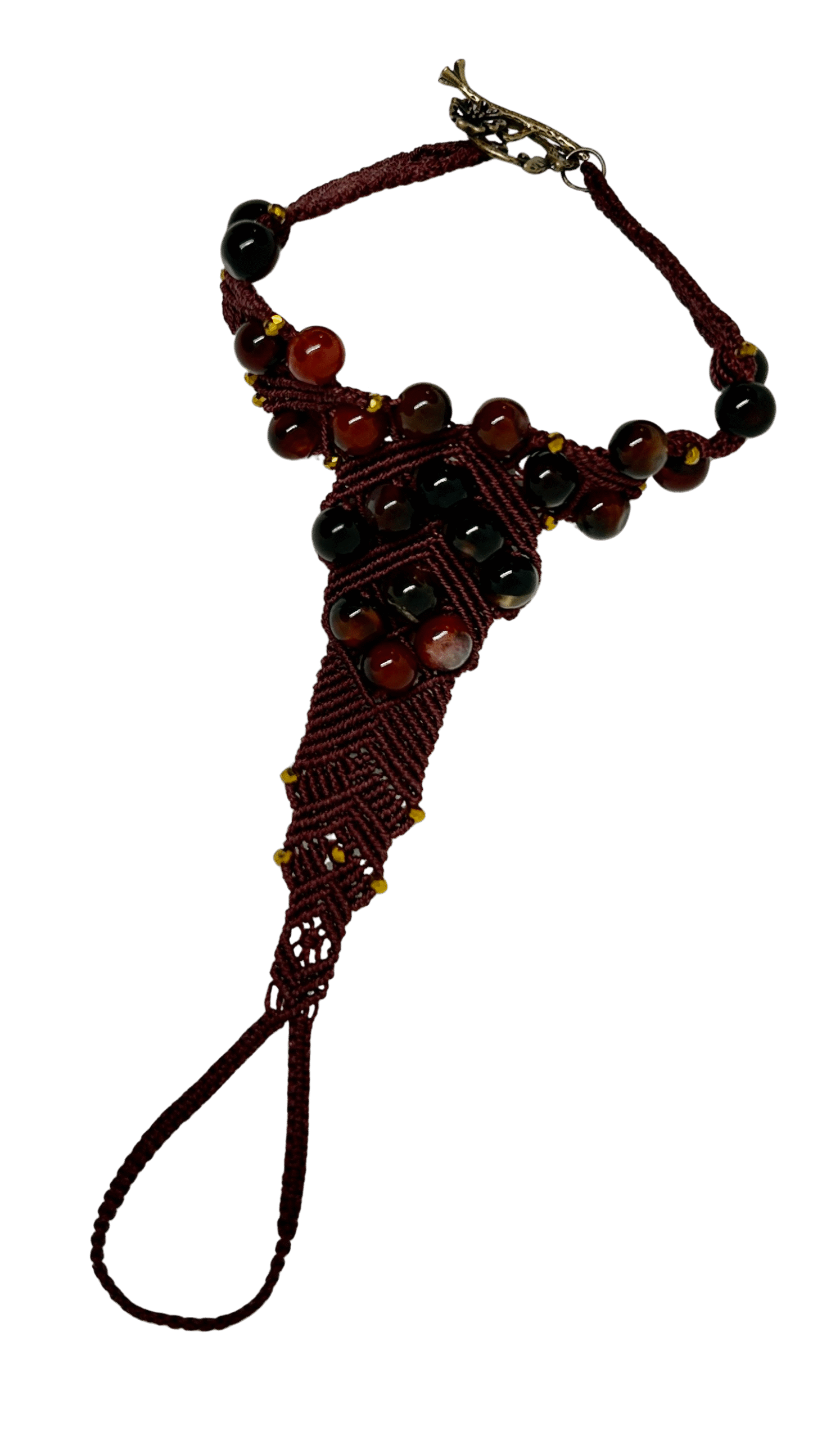 Valmistatud kvaliteetsest S-lon mikro-makramee käsitööniidist, lisatud on soojades pruunides ja kumavates toonides poolvääriskivid karneoolid ja ahhaadid.