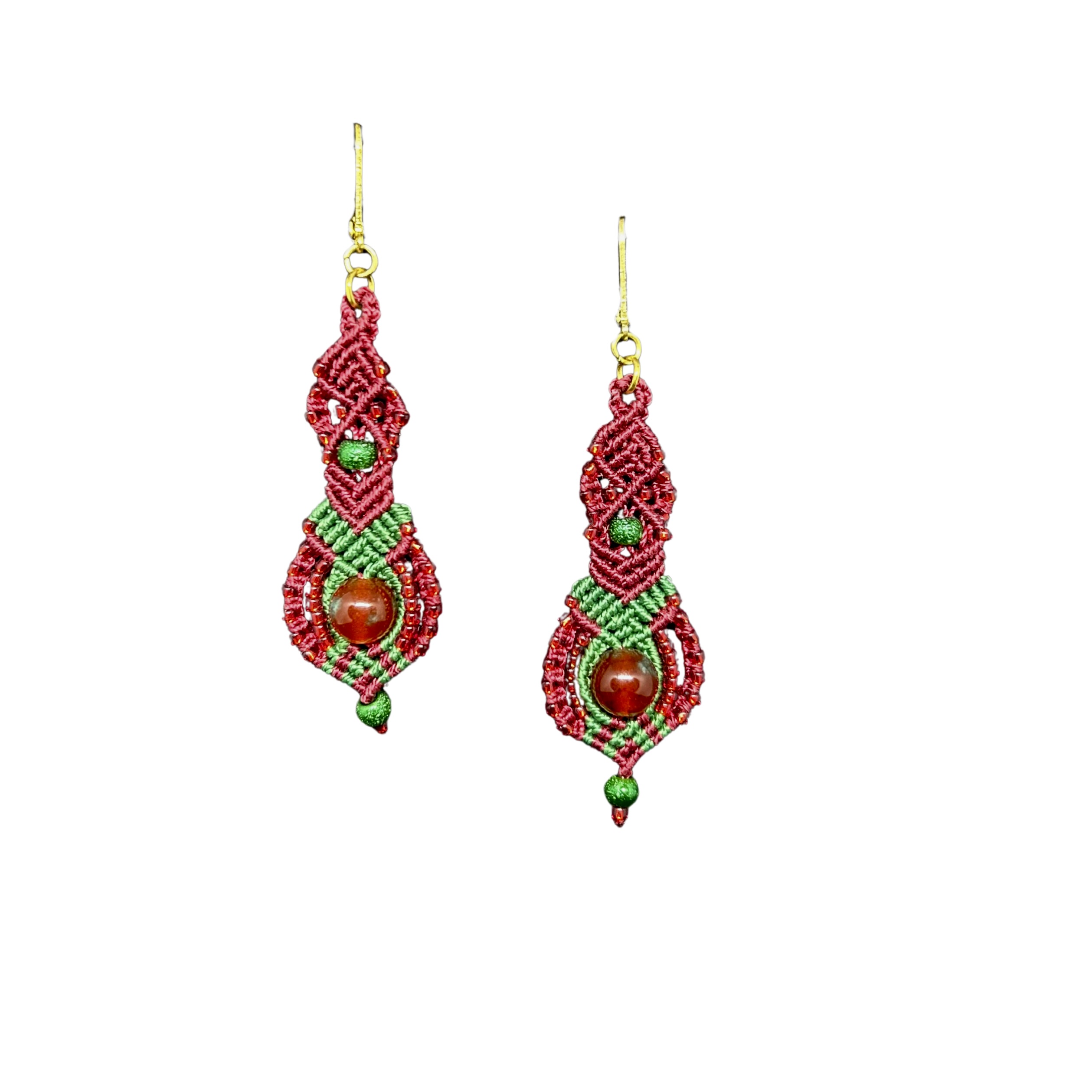 Valmistatud kvaliteetsest S-lon mikro-makramee käsitööniidist, lisatud on punase-rohelise kirjud poolvääriskivid jadeiit ja säravad punased seemnehelmed. Kõrvarõnga kinnitused on kullakihiga kaetud ja allergiavabad.