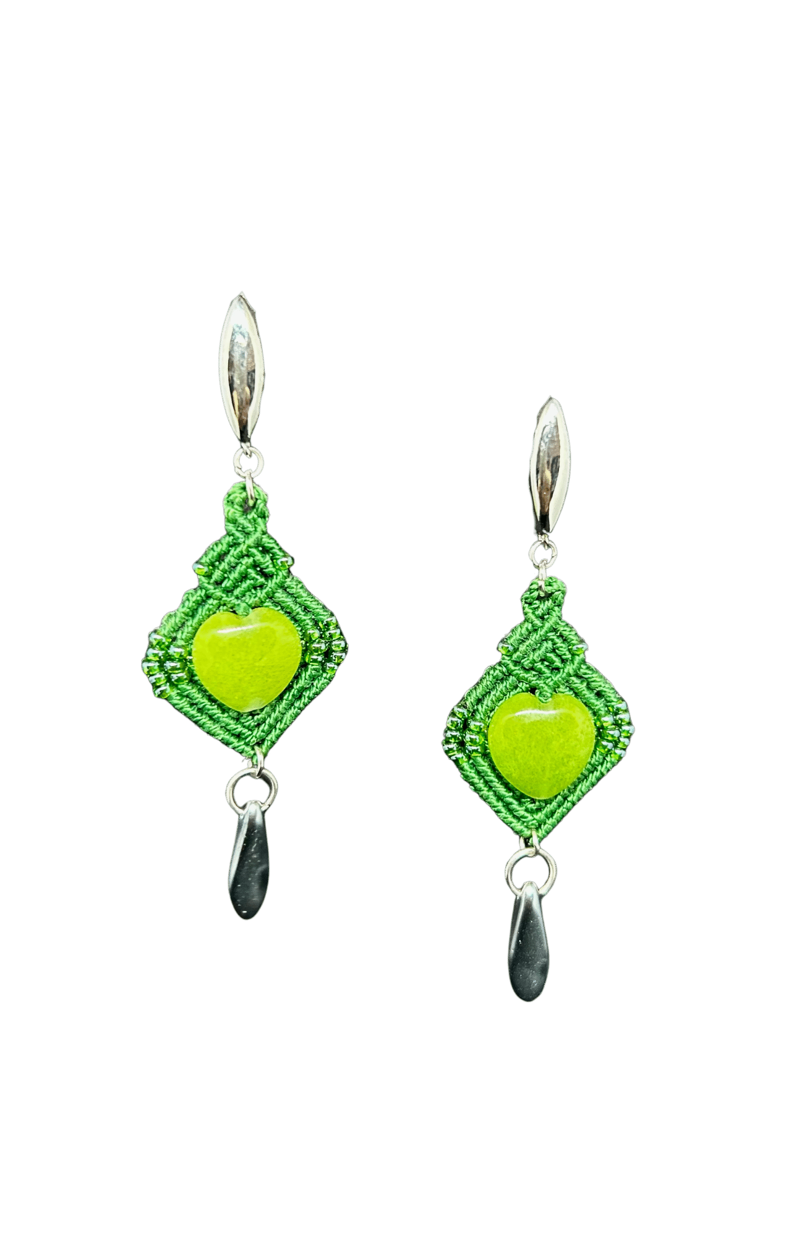 Valmistatud kvaliteetsest S-lon mikro-makramee käsitööniidist, lisatud on rohelised südamekujulised poolvääriskivid jadeiit. Kõrvarõnga kinnitused on hõbedast ja allergiavabad.