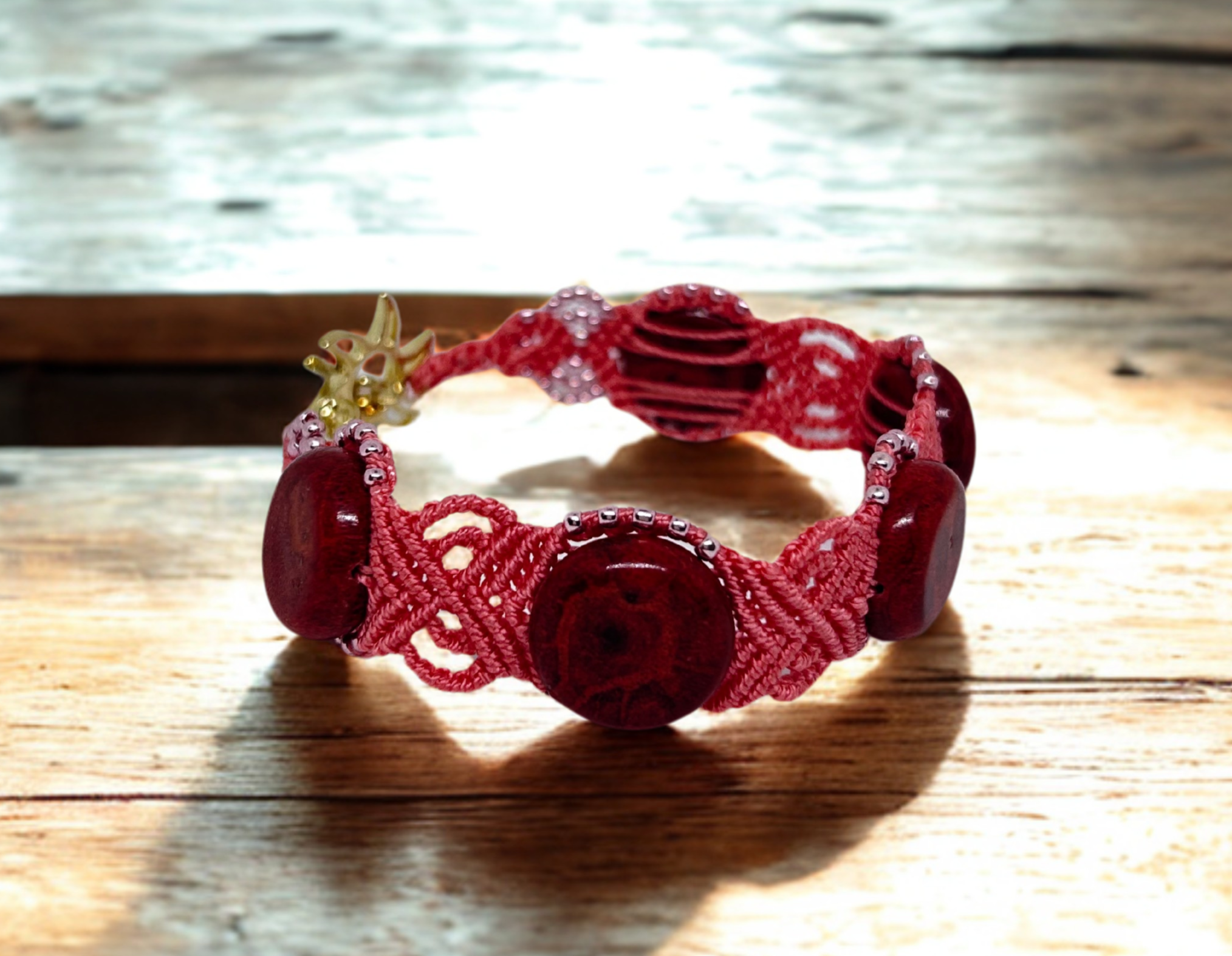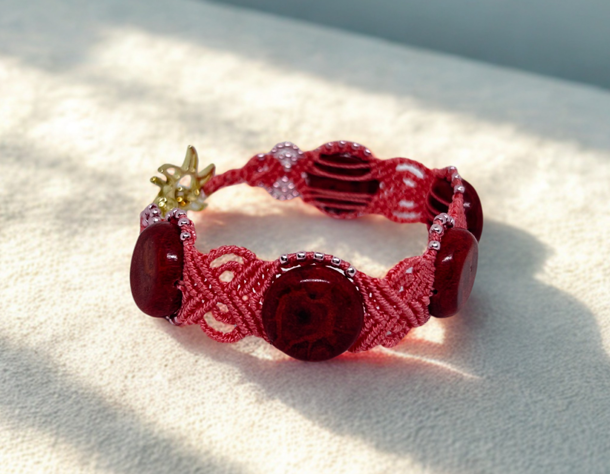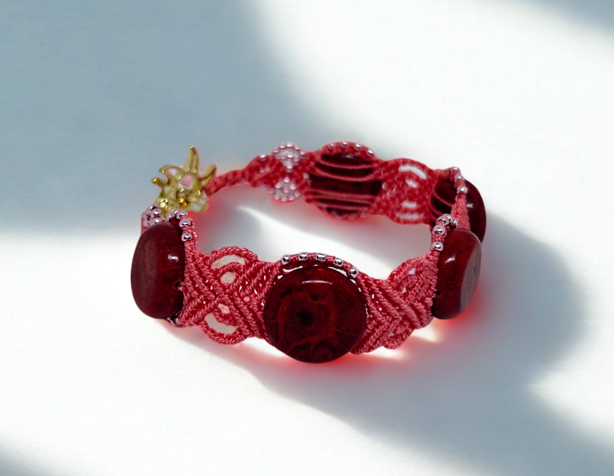 Valmistatud kvaliteetsest S-lon mikro-makramee käsitööniidist, lisatud on klaasist seemnehelmed.